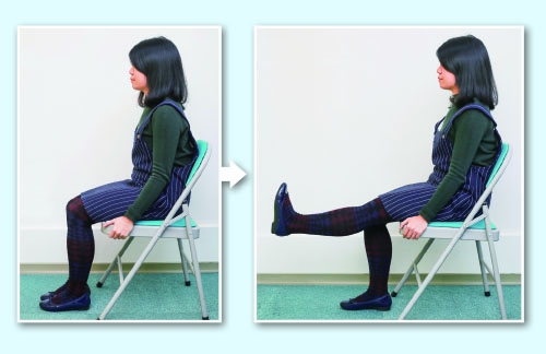 坐在椅子或辦公椅上,小腿往上抬起至膝蓋完全伸直,維持1至2秒鐘,再換另一腳,左右兩腳輪流做。這個動作不花什麼體力,很適合老人家,年長者可選擇有扶手的椅子,更加安全。此動作可強化股四頭肌的力量。