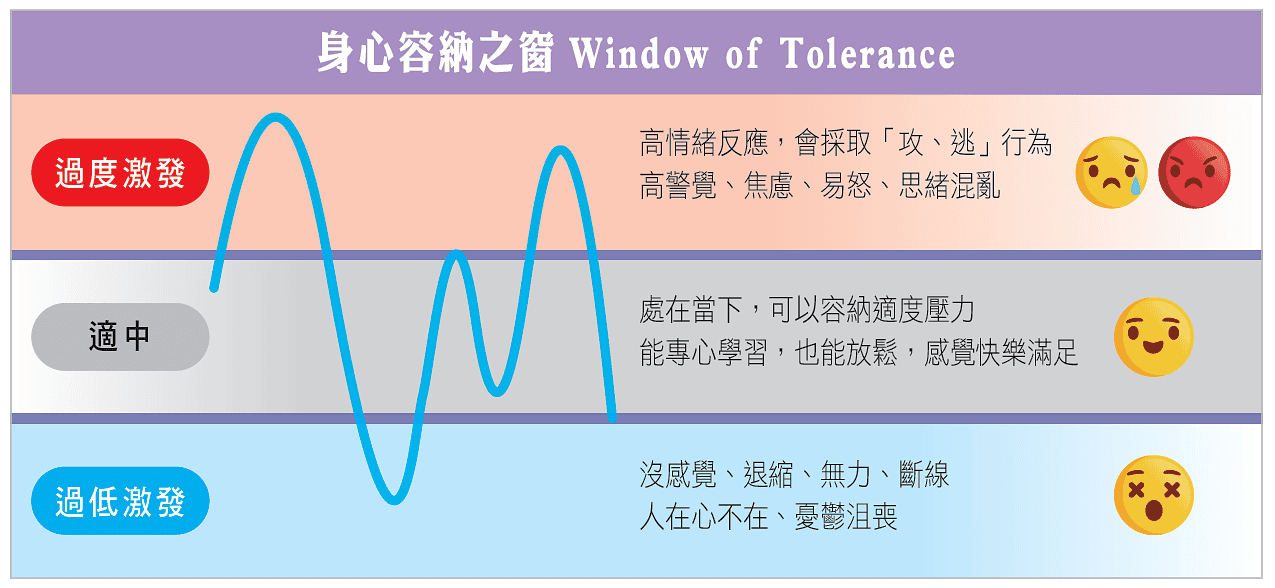 依據美國精神科醫師Dan Siegel提出的身心容納之窗(Window of Tolerance)模型指出,每個人都有一個自動調節情緒的範圍,在身心容納之窗的範圍內,能夠調節壓力、處理困境,但如果面臨過度的壓力,則處於「破窗」狀態。展現在理財投資上,不是過度消費、導致負債,就是太過保守而不敢花錢。因此,關照自身的身心狀態,並釋放過度壓力,也能降低過於極端的消費行為。