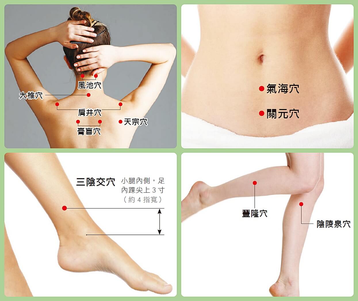 欲改善生理痛,可常用吹風機吹拂腹部氣海、關元、雙腳內側三陰交等穴位,並搭配有當歸成分的精油。