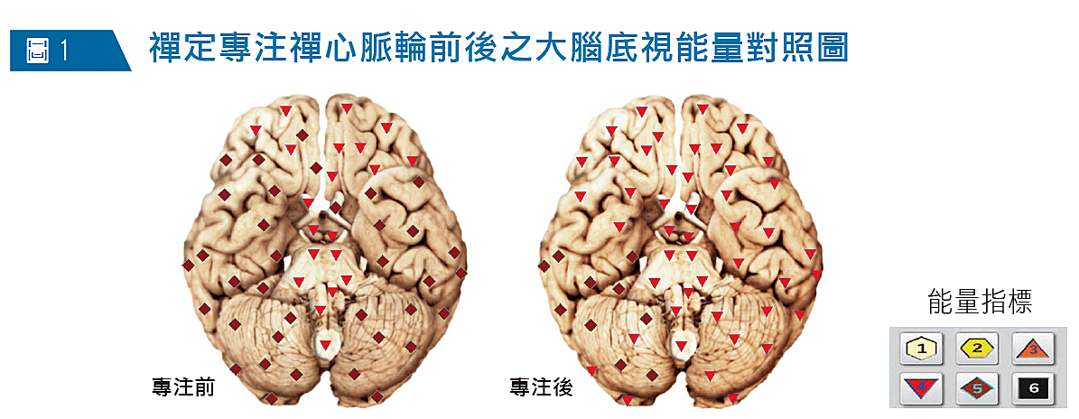 受測者為20歲的女學生,學習禪定1年,身心健康。依印心禪法十脈輪禪定法,專注禪心脈輪5分鐘,比對前後測的差異如圖2。