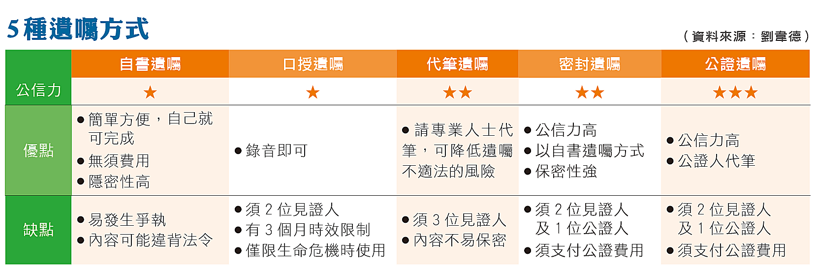 根據民法,遺囑分為自書、口授、代筆、密封和公證等5種類型(見下表);最簡單的是自書遺囑,最易引起爭議的是口授遺囑,而最有公信力的則是公證遺囑。不過,特別要強調的是自書遺囑,因為這是最方便,也是比較容易出錯的遺囑類型。