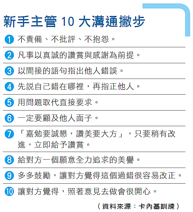 卡內基訓練行銷總監孫彬啟提到,溝通與人際關係很難脫鉤,因為人與人之間若關係良好,溝通起來便順暢;若關係不好,就算溝通技巧再好,也難以接軌。因此,新手主管在溝通時,要特別注意人際關係的處理。