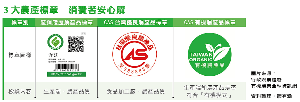 現今超市最常見的3種標章,分別為產銷履歷農產品標章、CAS台灣優良農產品標章及CAS有機農產品標章;另外還搭配兩種標示:生產追溯QR-Code及有機驗證公司標章。但並非所有蔬果商都會經過這些機構驗證,所以消費者在選購時,可得睜大眼睛。