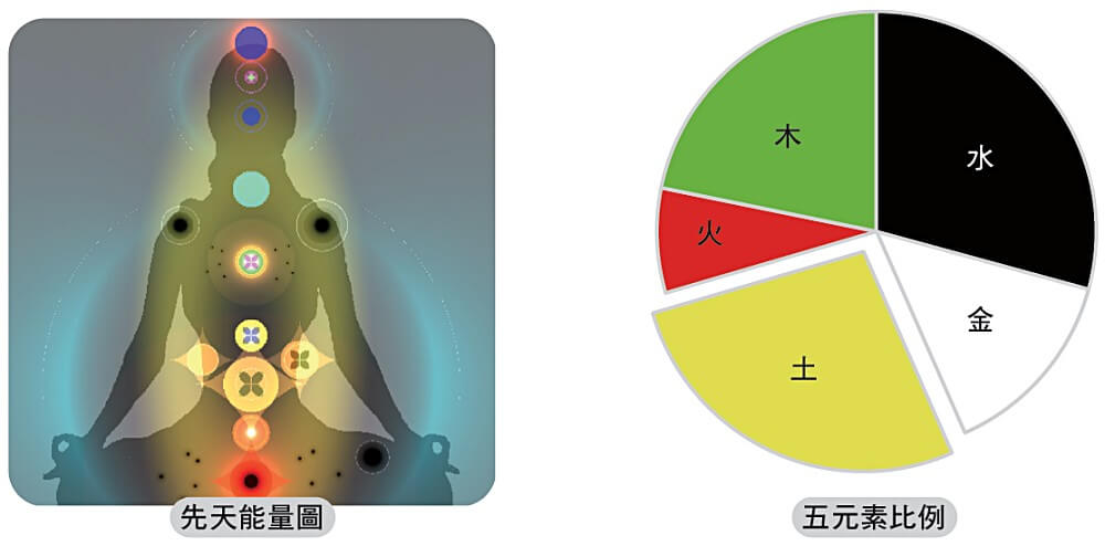 受測者是一名55歲男性主管,家庭及工作壓力均大。從下方左圖的先天能量圖可看出他的身光為紫光、能量值低、胸腔有黑點,容易有憂鬱狀況。右圖的五行圖則可分析出他是土型人,水多、木多,缺火(火生土)助力少,因此先天體質不佳。