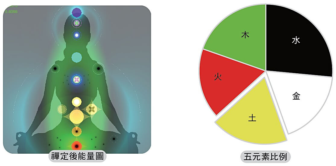 請受測者依十脈輪禪定法禪定10分鐘後,得到禪定能量圖如下,與現況圖比較,可看出左圖身上黑點持續變小,右圖的五行圖則可分析出,「木火土金水」等5種能量平衡,尤其火和土的能量增強,顯現出平衡穩定的身體能量狀態。