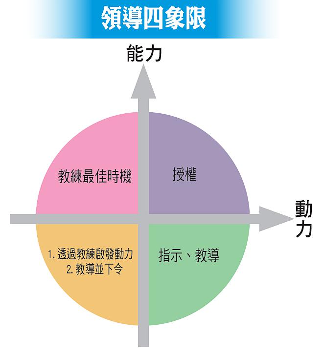 然而,若屬於左邊兩個象限,即動力不足的情形,則傳統管理學就無用武之地。陳世明說,若是左上方的象限,即能力足夠,只是缺乏動力,這時是教練最適合發揮的時機;若動力與能力均不足,也就是左下方這個象限,先要透過教練給予啟發,激發其動力,再予以教導,採取兩階段的領導模式。