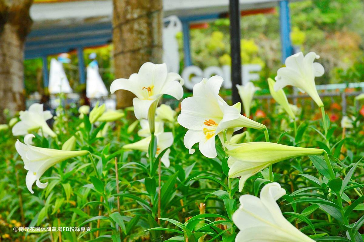 也許是受了氣候不穩定的影響,或是南元農場裡的野百合等不及春天的到來,想要提早跟大家見面,冬天的南元休閒農場,滿山滿谷都是野百合,真是美呆了。農場裡的野百合屬於台商原生種麝香百合花,又名鐵砲百合,色純白,能散發淡雅芳香素潔宜人,球根可食用或藥用,切花是上等的插花材料適合盆栽或花壇栽培,因為象徵百年好合,所以深受國人喜愛。逢結婚旺季,在南元農場裡,天天都可看到成雙成對的新人拍攝結婚照,也是一大特色。