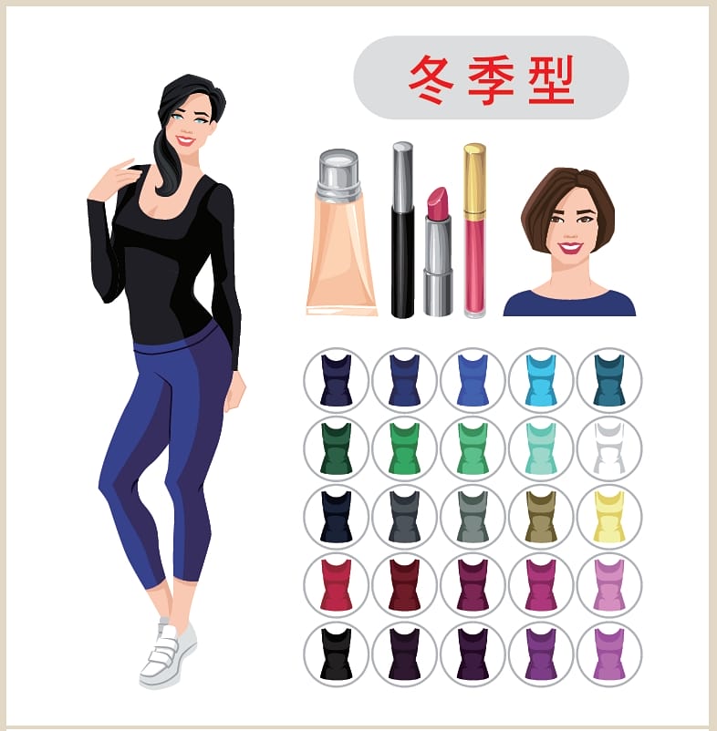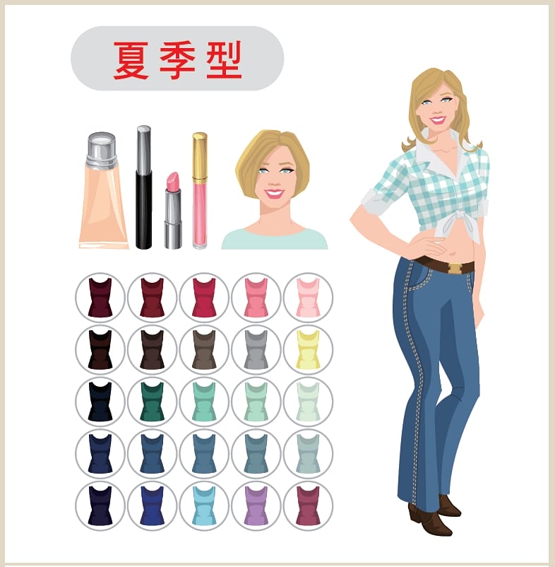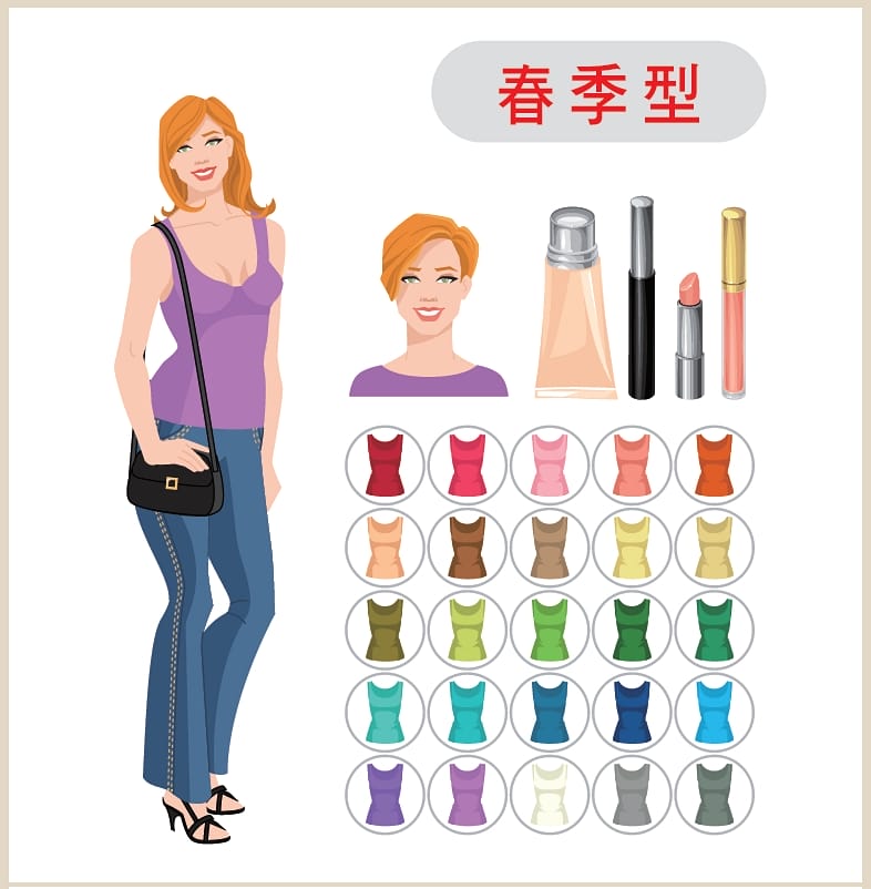 依照不同的色彩屬性,可分成「春、夏、秋、冬」4 種個人色彩類型。以下的衣著搭配風格提供參考。