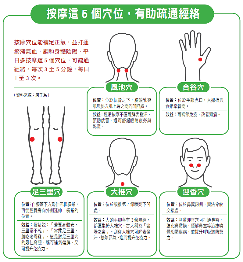 以中醫觀點來看,人體經絡相互交連、遍布全身,穴位按摩可有效疏通經絡,提升人體免疫力。流感是「外邪」入侵身體,按摩穴位能補足正氣,並打通瘀滯氣血,調和身體陰陽,比起吃藥帶來的副作用,按摩穴位的好處更多。周子為提供了5個人體穴位,平日可自行按摩,每次3至5分鐘,每日1到3次,有助疏通經絡。
