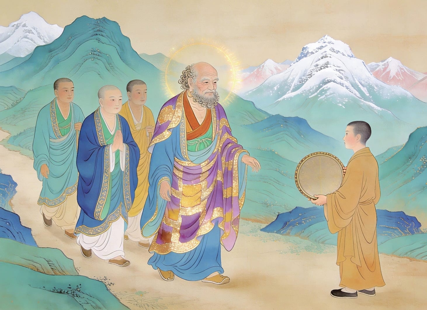 僧迦難提尊者帶領弟子走在山路上,遇到一名童子手持圓鏡迎面而來。