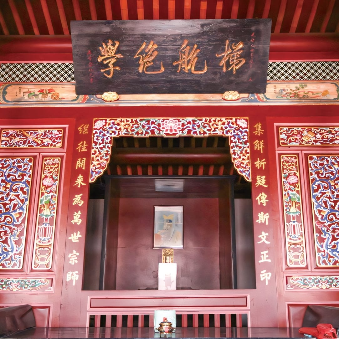 正廳上方掛著「梯航絕學」匾額,為清光緒15年(1889年)進士莊俊元所題,是目前保存最早的文物原件。「絕學」二字出自北宋理學家張載的名言──「為天地立心,為生民立命,為往聖繼絕學,為萬世開太平」;「梯航」則有攀山涉水、歷經險阻之意。廳內懸掛一幅孔子畫像,供案上供奉著朱熹神位。