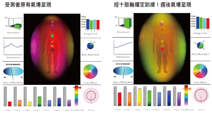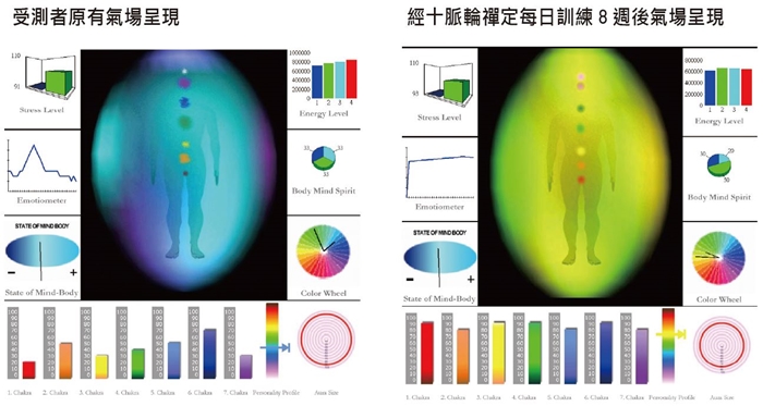 某位30歲女性工作能力佳,經儀器測試,脈輪能量只有30分,外在氣場卻高達90分,可見其工作壓力甚大,身心負荷沉重。經每日修鍊十脈輪8週後再次檢測,脈輪能量提升至90分,外在氣場降為80分,表示身心狀態已達平衡。